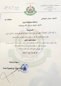 بعثت حركة المقاومة الإسلامية حماس مكتب اليمن (صنعاء) برقية عزاء ومواساة إلى محافظ محافظة شبوة اللواء الركن عوض محمد بن فريد العولقي في وفاة المجاهد العقيد غازي عوض محمد بن فريد العولقي ، والذي انتقل إلى جوار ربه بعد مسيرة حافلة بالعطاء والبذل في سبيل الله والوطن .