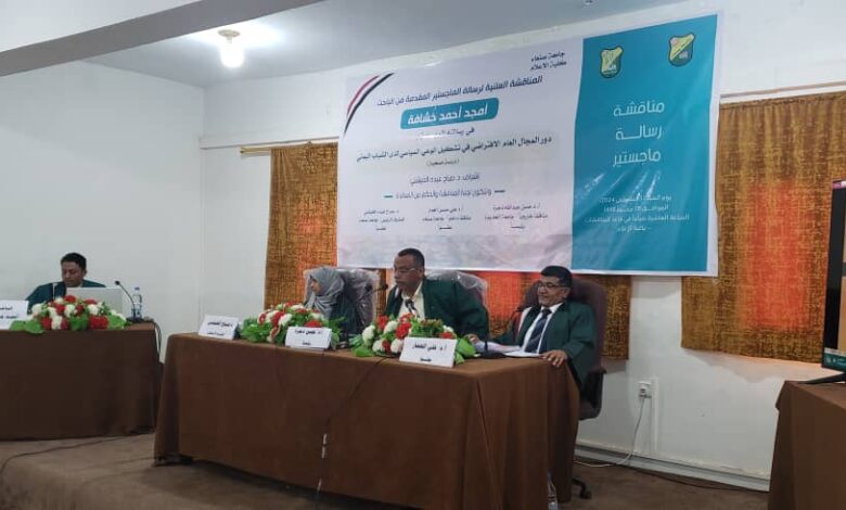 حصل الباحث أمجد أحمد خُشافة على درجة الماجستير بامتياز من قسم الصحافة والنشر الإلكتروني بكلية الإعلام جامعة صنعاء، عن رسالته الموسومة بـ” دور المجال العام الافتراضي في تشكيل الوعي السياسي لدى الشباب اليمني .. دراسة مسحية”.