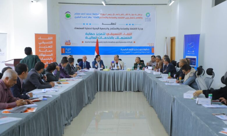 عقد اليوم بصنعاء اللقاء التنسيقي لتعزيز حماية المستهلك بالخدمات المالية نظمته الجمعية اليمنية لحماية المستهلك بالشراكة مع وزارة الاقتصاد والصناعة والاستثمار.