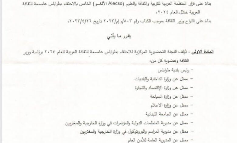 المادة الأولى: تؤلف اللجنة التحضيرية المركزية للاحتفاء بطرابلس عاصمة للثقافة العربية للعام 2024 برئاسة وزير الثقافة وعضوية كل من: