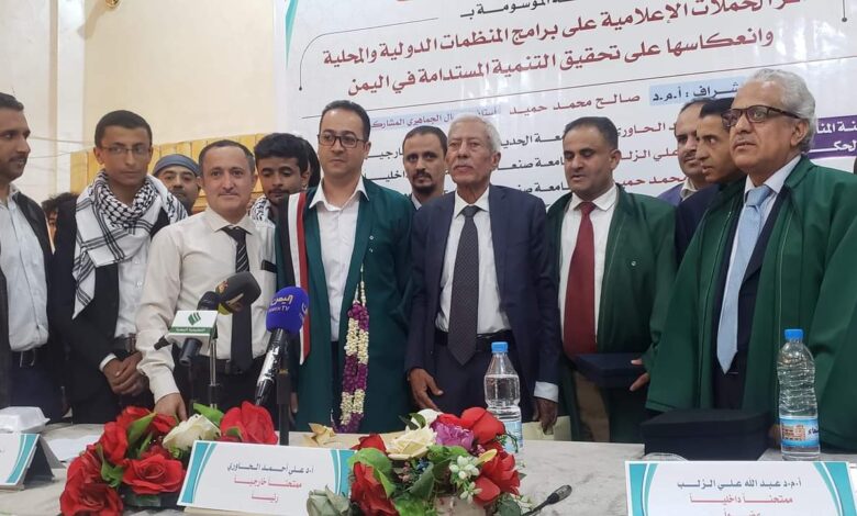نال الباحث محمد عبد الولي السقاف درجة الدكتوراه بامتياز من مركز أبحاث التنمية الشاملة بجامعة صنعاء عن أطروحته الموسومة بـ” أثر الحملات الإعلامية على برامج المنظمات الدولية والمحلية وانعكاسها على تحقيق التنمية المستدامة في اليمن”.