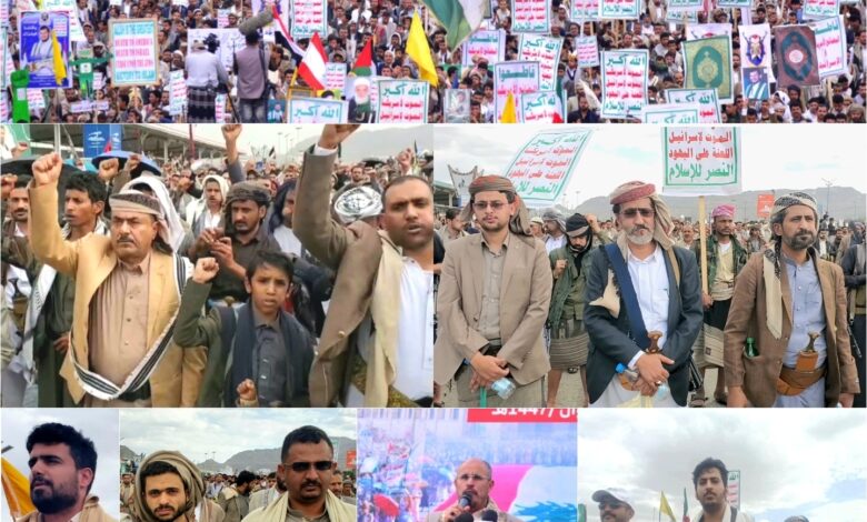 وجددت الحشود التي رفعت أعلام اليمن وفلسطين ولبنان وإيران والعراق، تفويضها المطلق لقائد الثورة السيد عبدالملك بدر الدين الحوثي، والتأكيد على الاستعداد والجهوزية لكل التطورات المحتملة في مواجهة أعداء الأمة أمريكا وإسرائيل وأذنابهم.