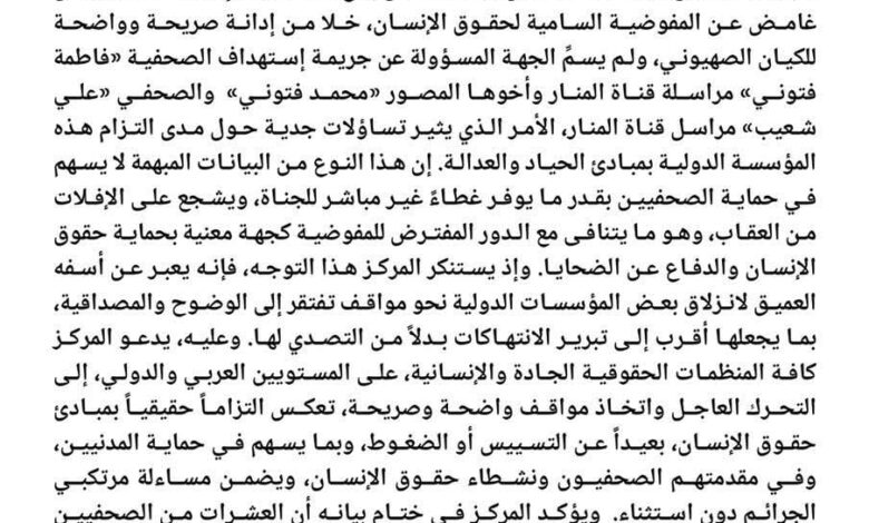 يعبر مركز عين الإنسانية للحقوق والتنمية عن بالغ استغرابه وإدانته لصدور بيان غامض عن المفوضية السامية لحقوق الإنسان، خلا من إدانة صريحة وواضحة للكيان الصهيوني، ولم يسمِّ الجهة المسؤولة عن جريمة إستهداف الصحفية “فاطمة فتوني” مراسلة قناة المنار وأخوها المصور “محمد فتوني” والصحفي “علي شعيب” مراسل قناة المنار، الأمر الذي يثير تساؤلات جدية حول مدى التزام هذه المؤسسة الدولية بمبادئ الحياد والعدالة.