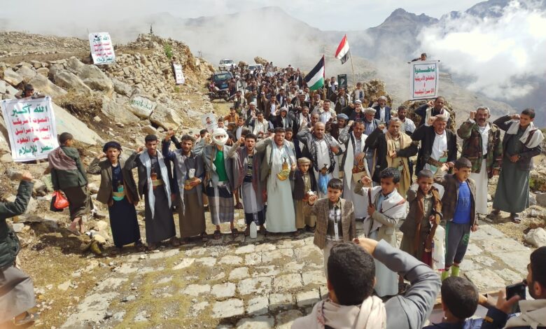 مسيرة حاشدة لأبناء الأشمور بمحافظة عمران تجدد العهد بالصمود ونصرة قضايا الأمة