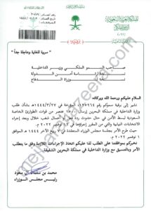 نشير إلى برقية سموكم رقم 125964، المؤرخة في 27/3/1444هـ بشأن طلب وزارة الداخلية في مملكة البحرين