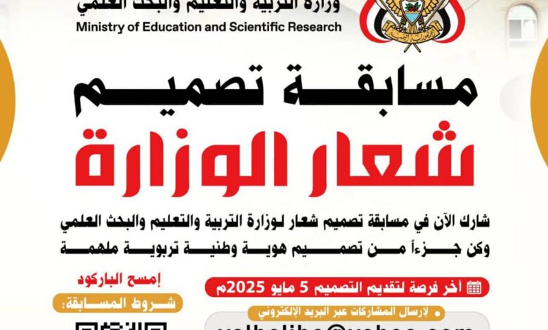 اعلنت وزارة التربية والتعليم والبحث العلمي عن إطلاق مسابقة مفتوحة لتصميم شعار جديد يعكس رؤيتها وتوجهاتها المستقبلية، ويدمج بين الهوية الوطنية والقيم التربوية والتعليمية، داعية جميع المبدعين والمصممين للمشاركة والمساهمة في رسم ملامح هوية بصرية مميزة للوزارة.